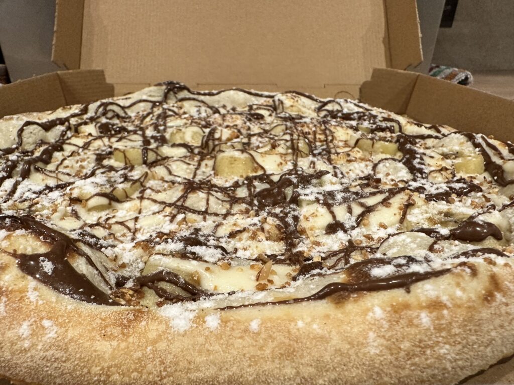 (Crème fraîche, lardons, pommes de terre, oignons, reblochon, olives, origan)